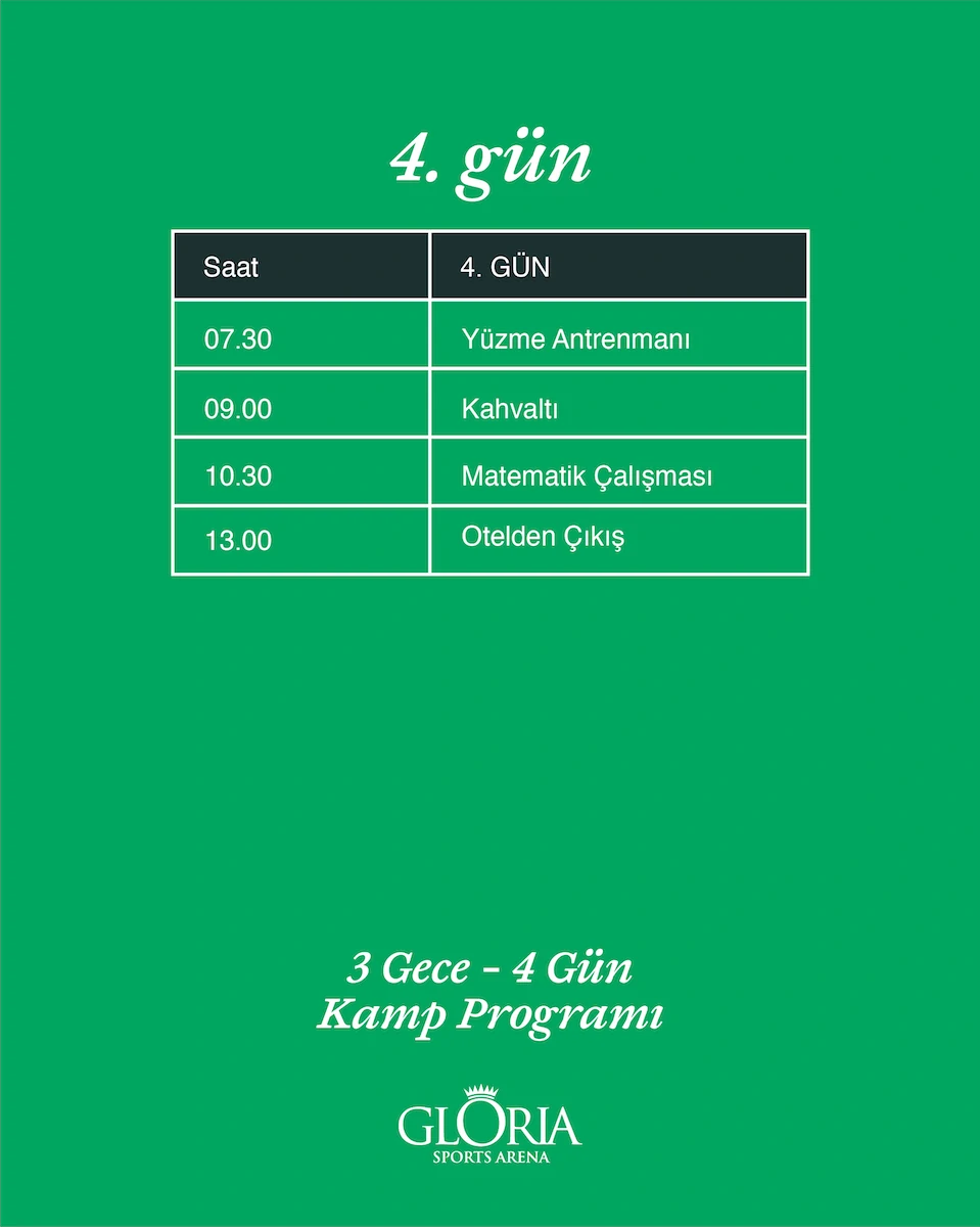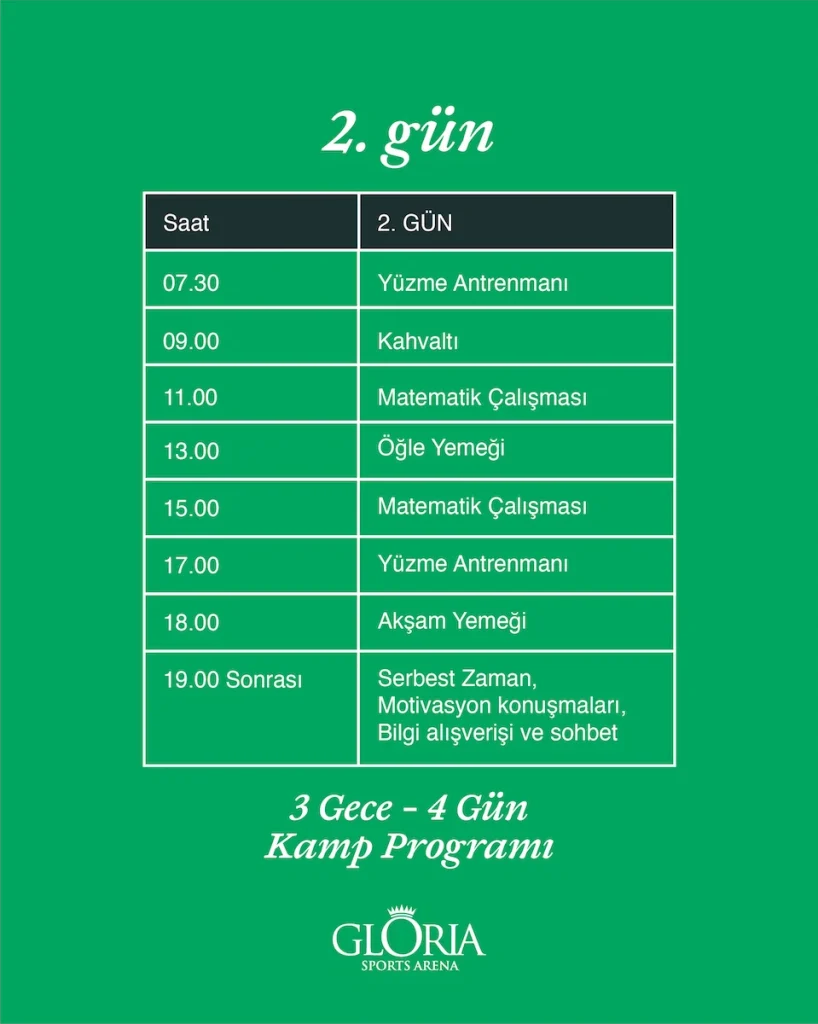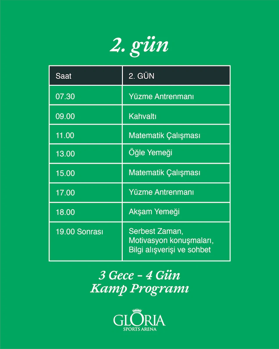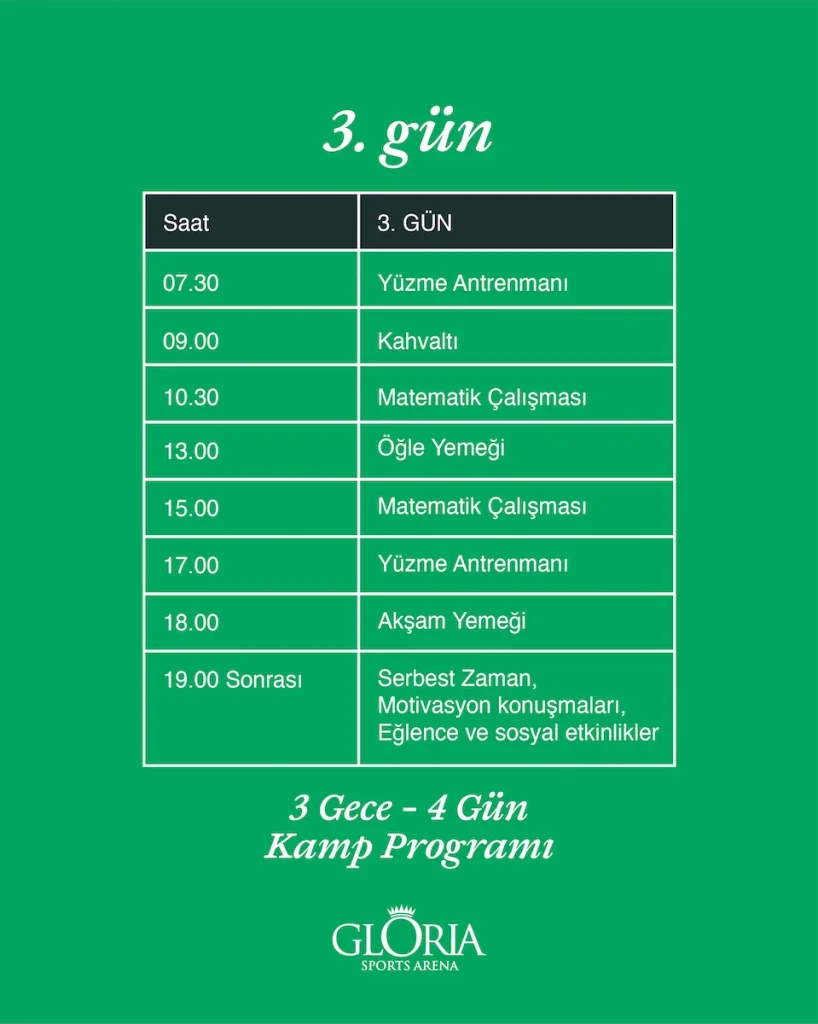 Gloria Sports Arena’da düzenlenecek bu harika kampımız için aşağıdaki Kamp Programı görsellerine tıklayarak programı gün be gün inceleyebilirsiniz. Ayrıca aşağıda bulunan ön kayıt formunu doldurarak Matematik ve Yüzme Kampı için katılım talebinizi iletebilirsiniz!